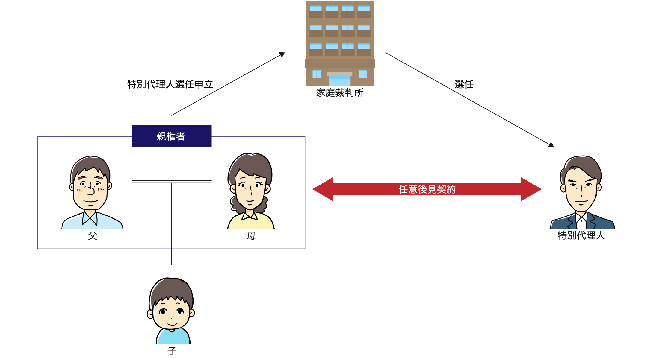 このような場合、家庭裁判所に特別代理人選任申立(民法826条2項)を行い、任意後見契約を締結するためだけの特別代理人を選んでもらい、当該特別代理人と親が任意後見契約を締結する方法が考えられます。